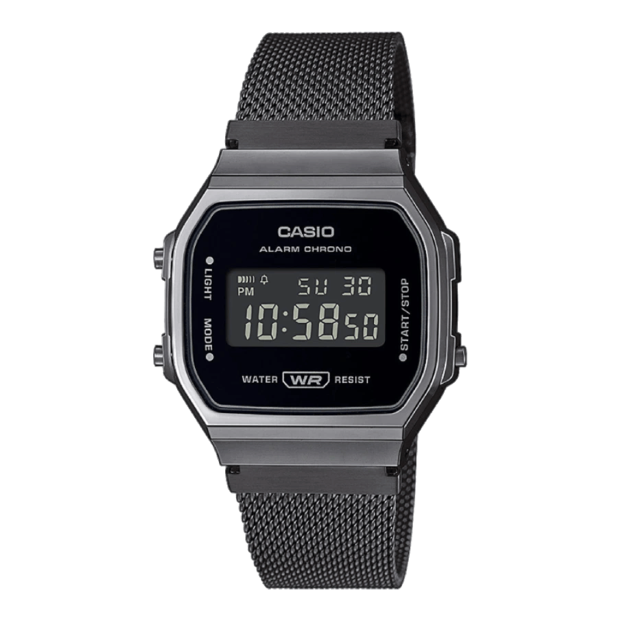Die Casio A168WEMB-1BEF kombiniert den Charme der 80er Jahre mit zeitgemäßer Funktionalität. Ihr schwarzes Edelstahl-Mesh-Armband und das schwarze Zifferblatt verleihen ihr einen minimalistischen Retro-Look, der sowohl im Alltag als auch zu besonderen Anlässen überzeugt.