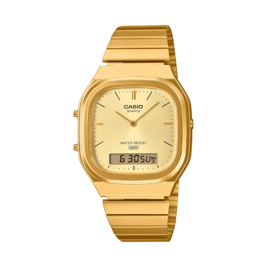 Das eckige, goldfarbene Gehäuse verleiht der Casio AQ-240EG-9AEF einen markanten Vintage-Look, während das fein abgestimmte Edelstahlarmband für einen sicheren Sitz und hohen Tragekomfort sorgt. Das goldene Zifferblatt mit klaren Indizes unterstreicht den eleganten, reduzierten Stil dieser Casio Armbanduhr.