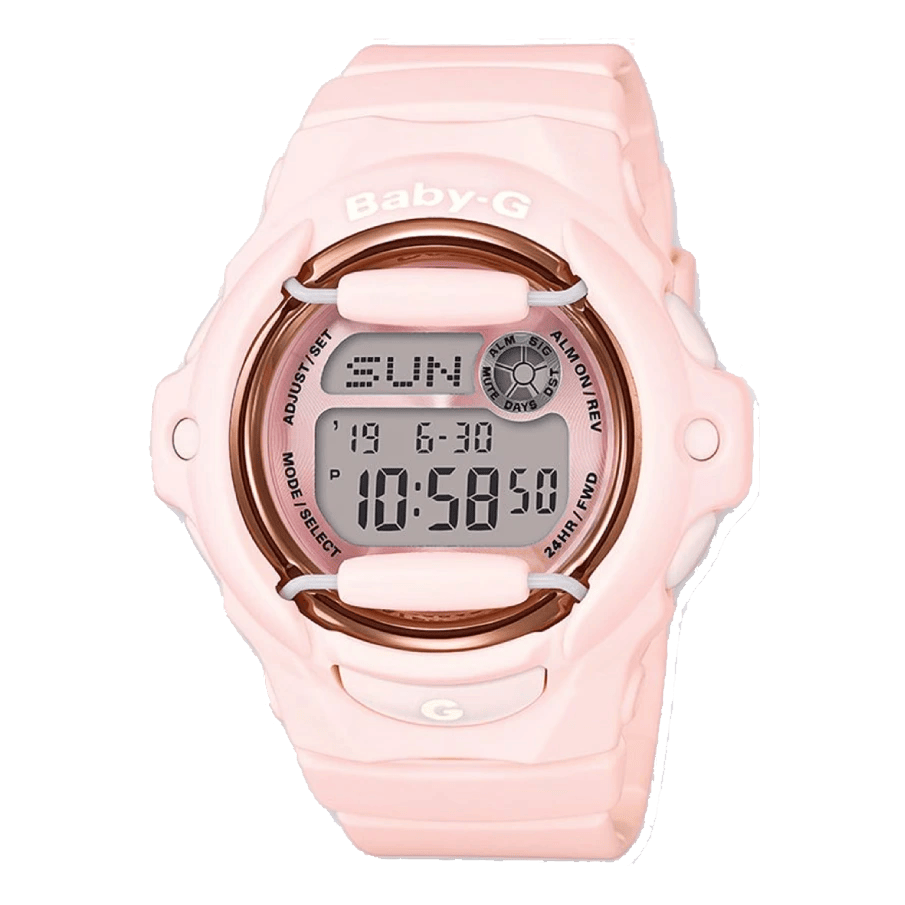 Die Casio BG-169G-4BER kombiniert Robustheit mit femininem Stil. Ihr roségoldenes Gehäuse und das roségoldene Harzarmband verleihen ihr einen schicken Look, während die digitale Anzeige zahlreiche Funktionen für den täglichen Gebrauch bietet.