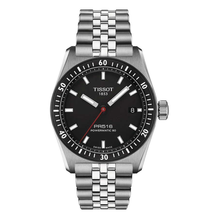 Die Tissot PR 516 Powermatic 80 Schwarz-Edelstahl verbindet Motorsport-Geschichte mit moderner Schweizer Uhrmacherkunst. Das sportliche Retro-Design dieser Uhr zeigt sich im charakteristischen 38 mm Edelstahlgehäuse und dem kontrastreichen, schwarzen Zifferblatt mit markanten Leuchtindizes und Zeigern.