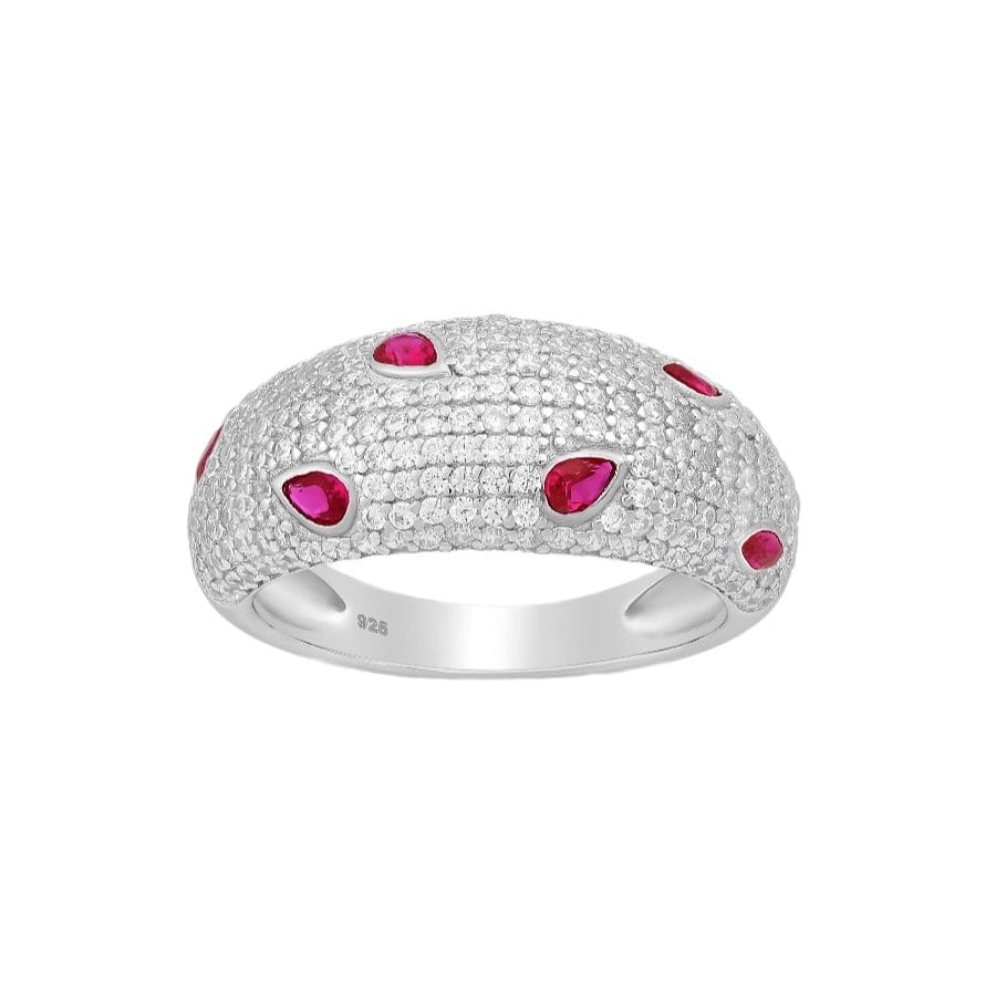 Der gesamte Ring ist mit unzähligen funkelnden Zirkonia-Steinen besetzt, die für einen atemberaubenden Glanz sorgen. Die roten Akzente in Tropfenform setzen dabei stilvolle Farbtupfer und verleihen dem Ring eine besondere Note.